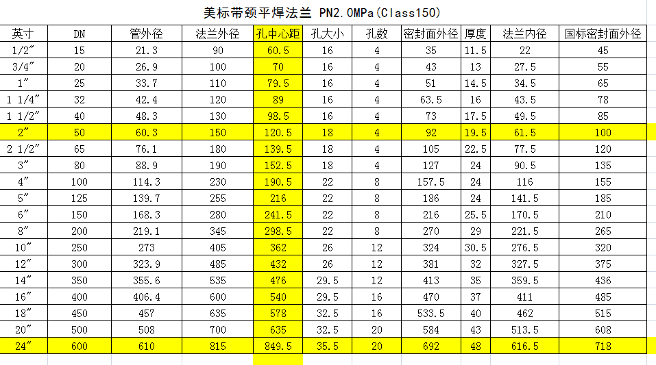 美標(biāo)法蘭通常是指作為美國 國 家標(biāo)準(zhǔn)的ASME B16.5、B16.36、b16.47、B16.48所描述的法蘭標(biāo)準(zhǔn)。美標(biāo)法蘭的壓力等級適用再PN2.5~PN4.0。材質(zhì)可為碳鋼、304、316、316L等。美標(biāo)法蘭尺寸標(biāo)準(zhǔn)和我們國標(biāo)或者行標(biāo)法蘭不同。那么,美標(biāo)帶頸平焊法蘭的尺寸是怎樣的呢?下面我們來了解一下:
