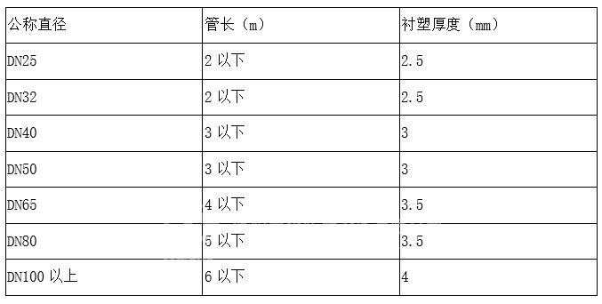 注:1.為保障管徑襯塑后符合工藝要求,DN65以下管道內(nèi)口徑應(yīng)大于原設(shè)計(jì)6-10mm。